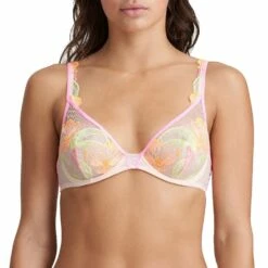 Dieser sommerliche und luftige Bügel-BH mit tiefem Ausschnitt zeigt mehr Dekolleté: eine betörende Passform! Das fast abstrakte Blumenmotiv in Neontönen ist ein echter Blickfang auf den transparenten Cups. Die feinen Träger sorgen für eine besonders kesse Note.