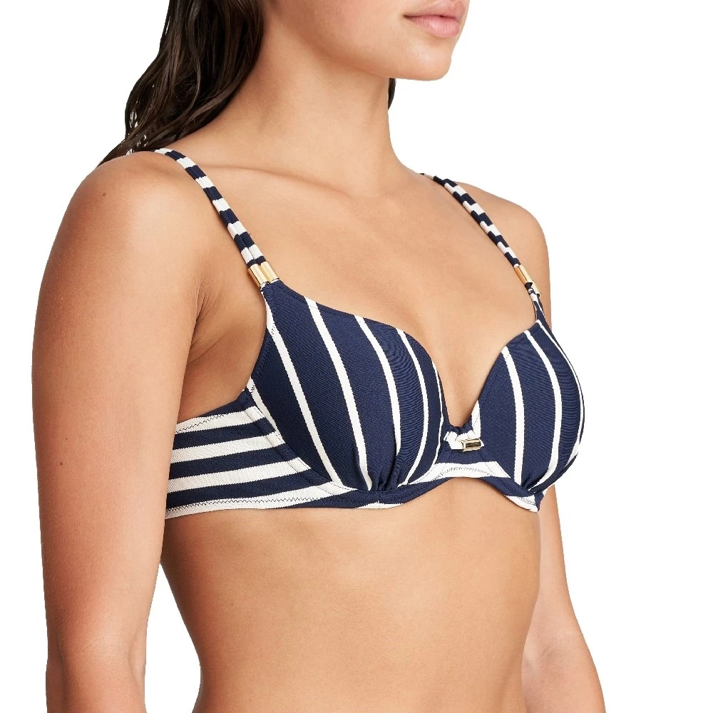 Ein sportlich-schickes Streifenmuster, bequeme gepolsterte Cups und eine unvergleichliche Passform: Dieses Bikini-Oberteil vereint all diese Merkmale. Die raffinierten Träger mit goldfarbenen köcherförmigen Details können gerade oder als Neckholder-Modell getragen werden.