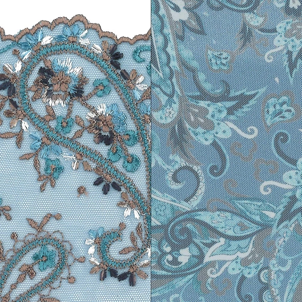 Autumn Blue ist ein zartes Blau mit schicker mehrfarbiger Stickerei.