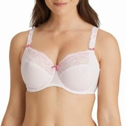Topmodischer Bügel-BH aus einem sommerlichen gestreiften Stoff und Stickerei in Spitzenoptik, die elegant in die Träger übergeht. Ein extrem luftiger Look für den Sommer mit einer