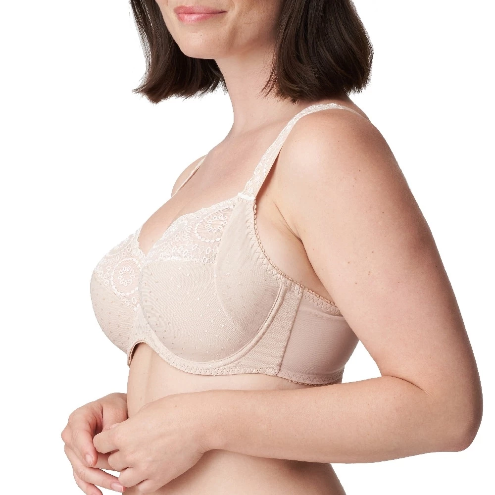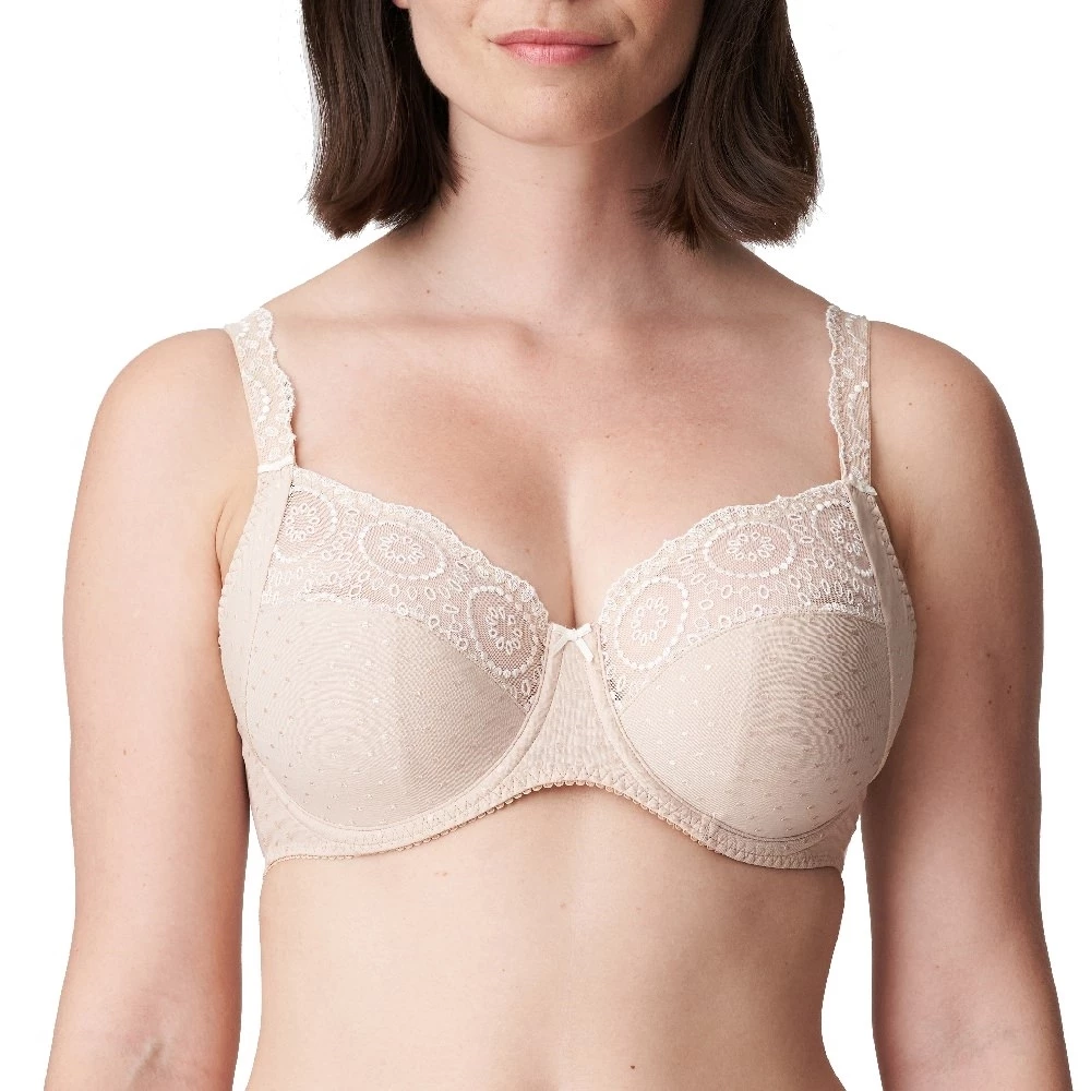 Eleganter Bügel-BH mit feiner Lochstickerei an den oberen Cups, die elegant in die Träger übergeht und Ihr Dekolleté umrahmt. Die unteren Cups sind blickdicht und leicht glänzend.