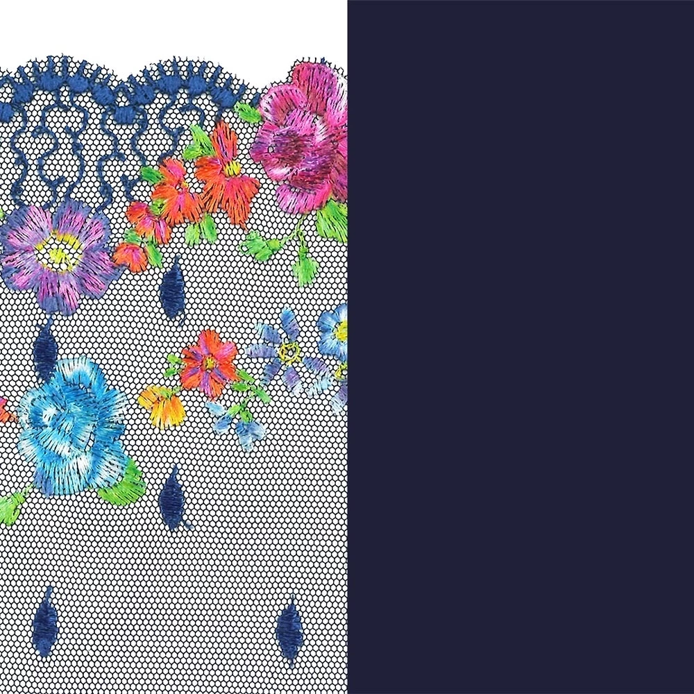 Water Blue ist ein zeitloses Marineblau mit bunten Blümchen am Dekolleté.