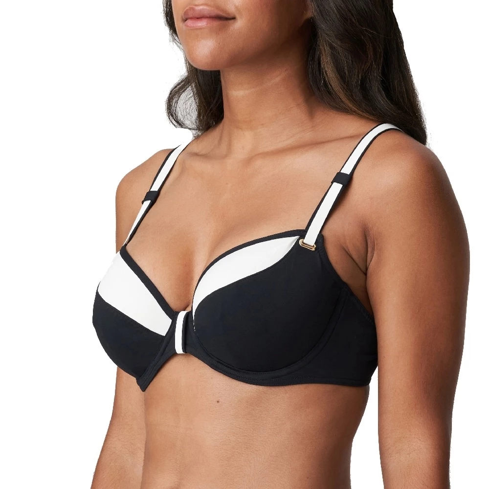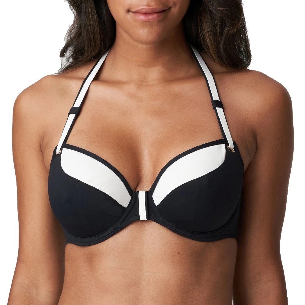 Stilvolles Bikini-Oberteil mit schlichtem grafischem Design, gepolsterten Cups und goldfarbenen Details. Die Träger können gerade oder als Neckholder-Modell getragen werden.
