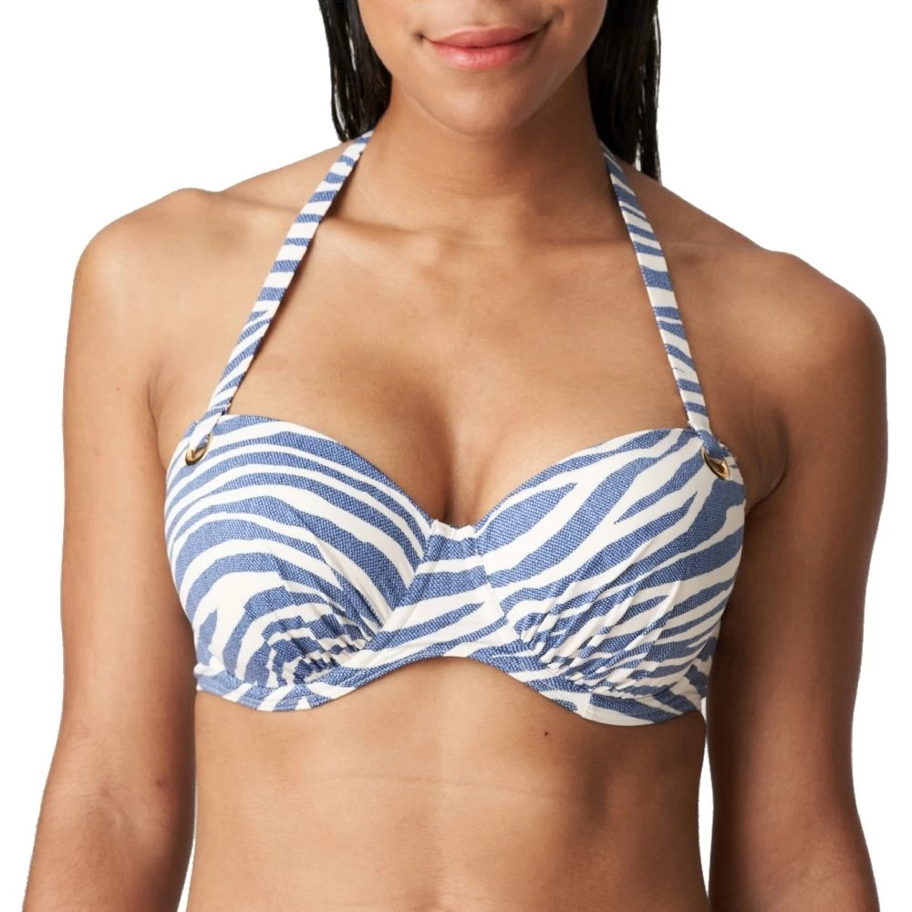 Bikini-Oberteil mit gepolsterten Cups und verführerischem Außenträgerschnitt. Der Bademodenstoff mit Denim-Look setzt sich in den Trägern fort, und die kupferfarbenen Ringe in den Cups runden den Look ab.